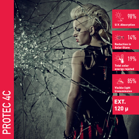 Le Protect 4 C est un film adhésif transparent conçu pour protéger les vitrages contre les actes de vandalisme tels que les graffitis, les rayures ou les gravures à l'acide. Il renforce également la sécurité en maintenant les fragments de verre en place en cas de bris, réduisant ainsi les risques de blessures.