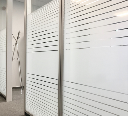 Il présente un motif de bandes horizontales opaques (“opaque horizontal stripes”) qui personnalise élégamment les vitrages et cloisons.
